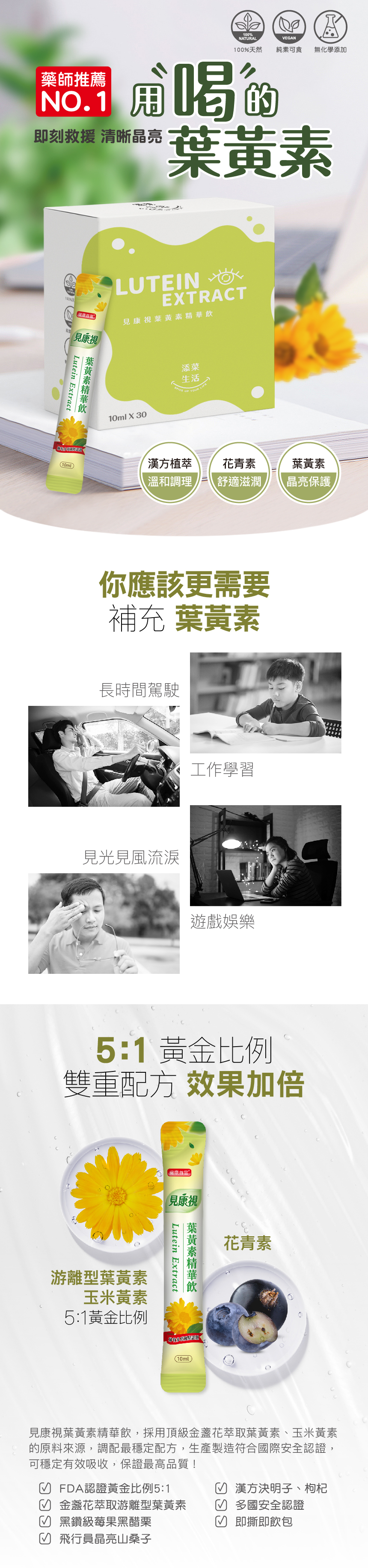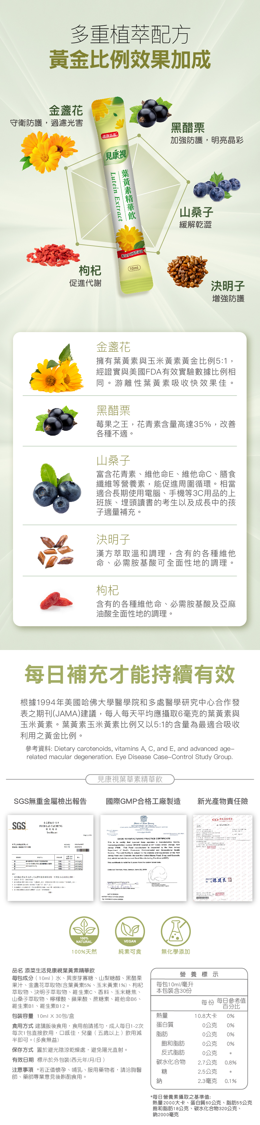 每包成分10ml含: 水、異麥芽寡糖、山梨糖醇、黑醋栗果汁、金盞花萃取物(含葉黃素5%、玉米黃素1%)、枸杞萃取物、決明子萃取物、維生素C、香料、玉米糖焦、山桑子萃取物、檸檬酸、蘋果酸、蔗糖素、維他命B6、維生素B1、維生素B12
